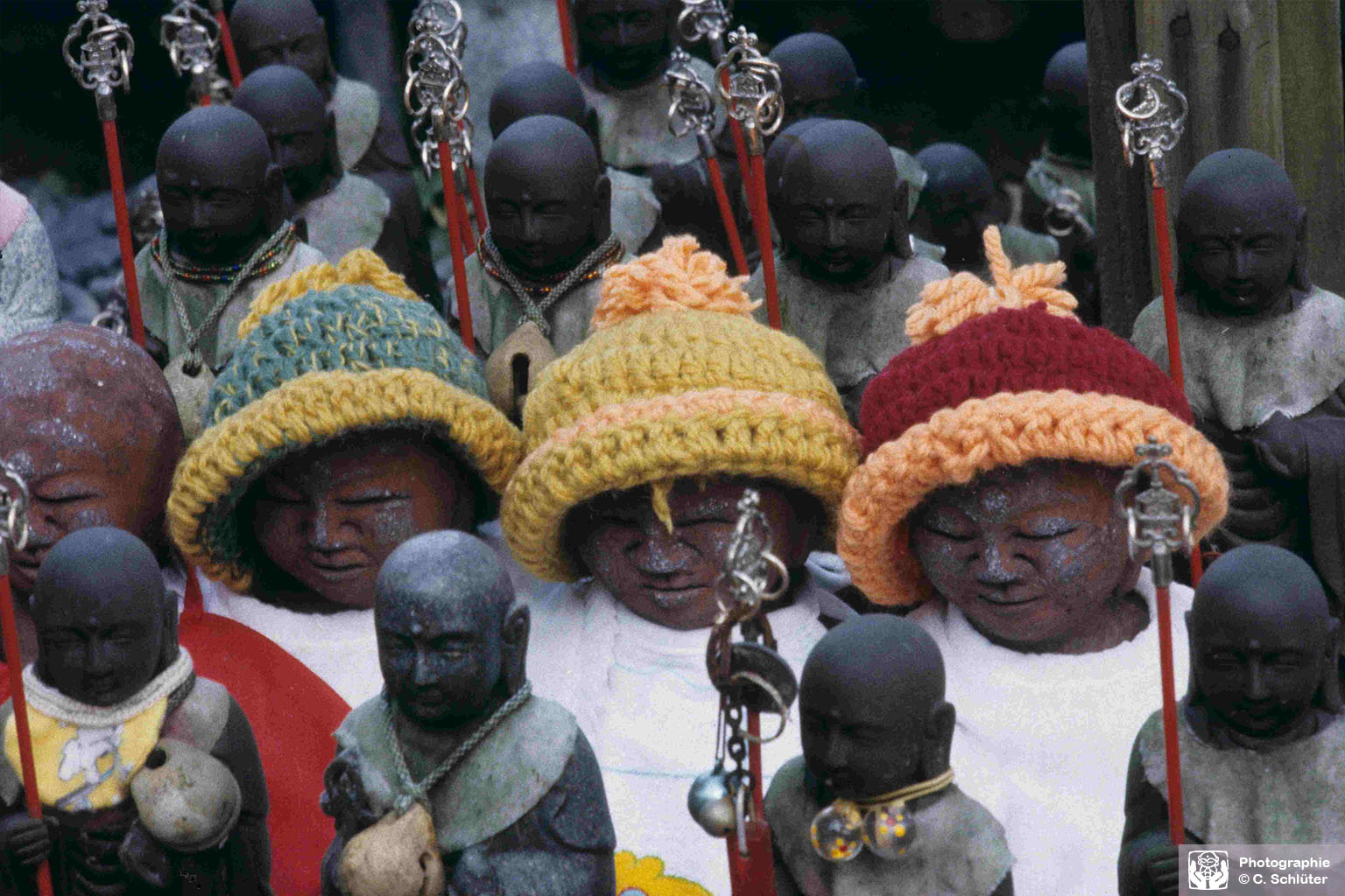 Der Bodhisattva Jizō ist eine der populärsten Gestalten des buddhistischen Pantheon in Japan. Keine andere Figur ist in der japanischen Volksseele so verwurzelt. Der kleine, kahlköpfige Wandermönch mit dem Rasselstab galt schon immer als Helfer und Seelentröster. Besonders in der kalten Leistungsgesellschaft von heute dient der Jizō als Projektionsfigur für Barmherzigkeit und Geborgenheit.
